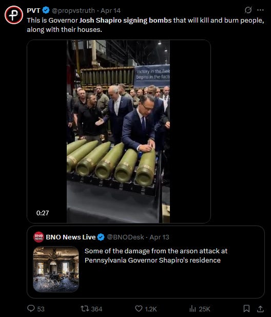 It’s a quote-tweet discussing Cody Balmer, who was apprehended after fire-bombing Pennsylvania Governor Josh Shapiro’s home a few days ago in retaliation for Shapiro’s unwavering support of Israel - “stop having my friends killed,” he said in his confession.1 They’re already comparing him to Luigi Mangione, the hunk that allegedly gunned down a CEO to rage against the healthcare machine.