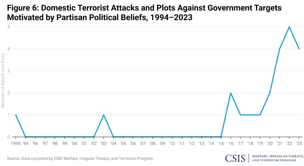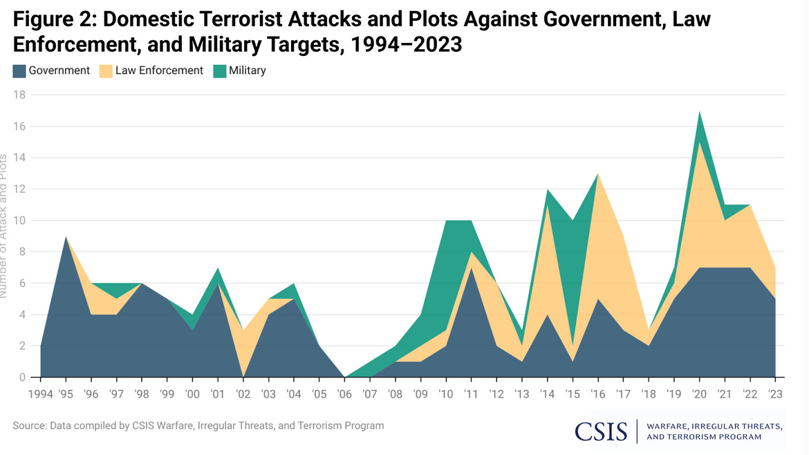 This would seem to suggest that terrorism (or at least, attempts at terrorism) is on the rise. Similarly, when looking specifically at government targets, the Center for Strategic Studies has found that domestic terror attacks are at the highest they’ve been in the past 30 years:4