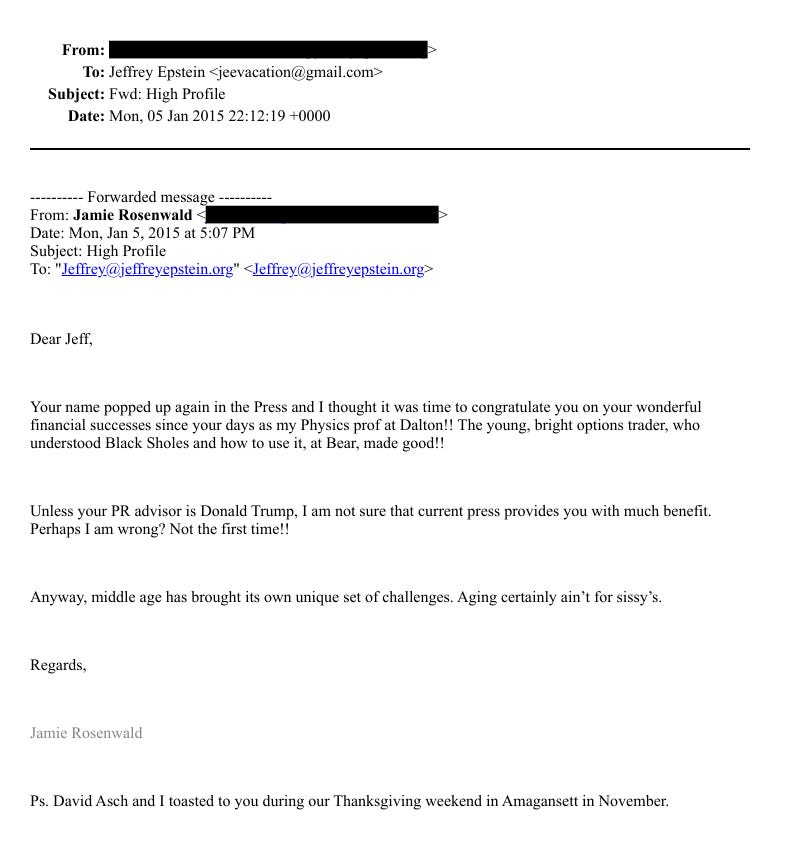 In one email from Jamie Rosenwald, an NYU adjunct professor and investment advisor, Rosenwald tells Epstein: “David Asch and I toasted to you during our Thanksgiving weekend in Amagansett in November.”