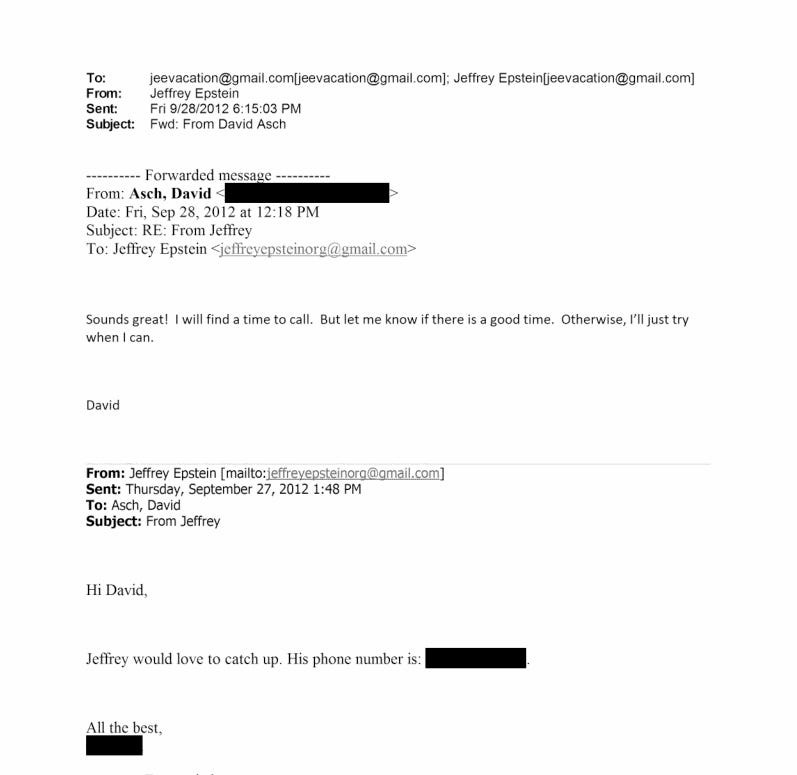 In a later exchange dated September 28th, 2012, what appears to be an assistant to Epstein replies to the email, indicating Epstein’s desire to talk with Asch over the phone. Asch responds: “Sounds great! I will find a time to call.”