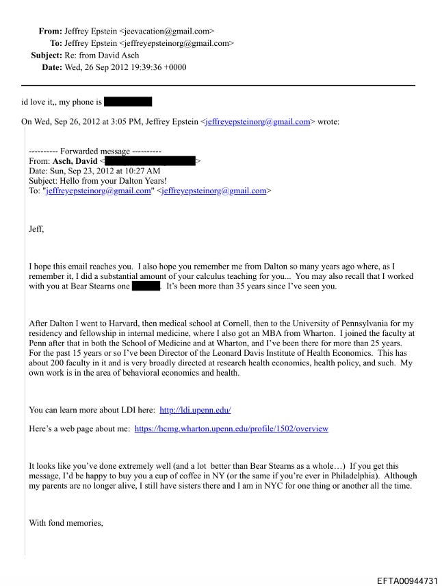 In an email titled, “Hello from your Dalton Years!” and dated September 23rd, 2012, apparently sent from David Asch’s email account, Asch writes to Epstein with nostalgia and expressing a desire to "catch up.”